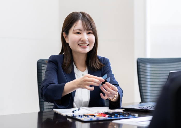 国内営業として、主に産業分野のお客様を担当しています。具体的には、製品提案やニーズ調査、受注後の納品対応、市場情報の収集と社内共有など多岐にわたります。産機分野の特徴として、医療機器や工場用機械など、普段目にする機会の少ない装置を扱うことが多く、自力で調べても具体的なイメージがつかみにくいことがあります。そのため、社内で先輩に相談するだけでなく、お客様に直接お伺いしながら情報を集めることを大切にしています。また、お客様のニーズを一度で正確に理解することは難しいため、複数回の面談を重ね、仮説を立てながら提案を行い、自分の考えや進め方の意図も含めて、丁寧に伝えるように工夫しています。